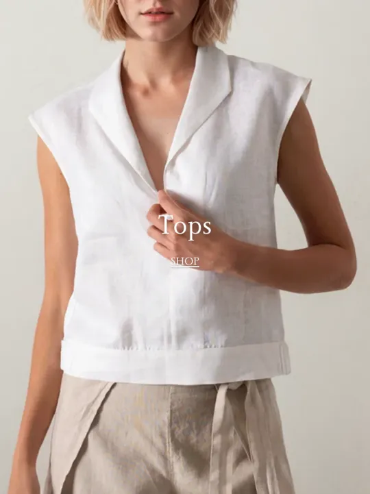 Cotton And Linen V Neck Plain Button Design Sleeveless Two-piece Set